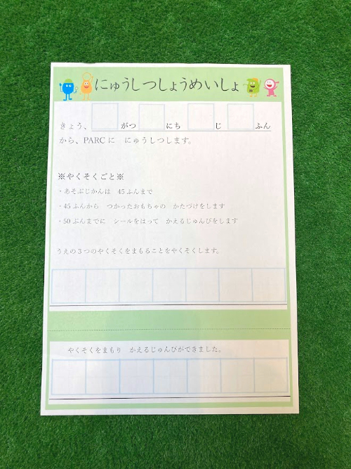 入室証明書は書く練習はもちろん、約束事が記載されているので文章を読む練習、約束を守る経験にも繋がります。