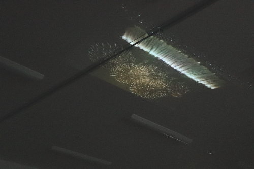 お部屋の照明を落として、プロジェクターで大きな花火を映し出しました。