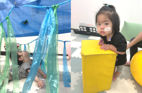 在宅酸素、経鼻胃管チューブ、胃婁、人工呼吸器などを装着しているお子さまのついても、看護師が事前に身体状況をアセスメントしたうえで、リハビリ専門職の評価、そして保育士による療育へと進めていきます。